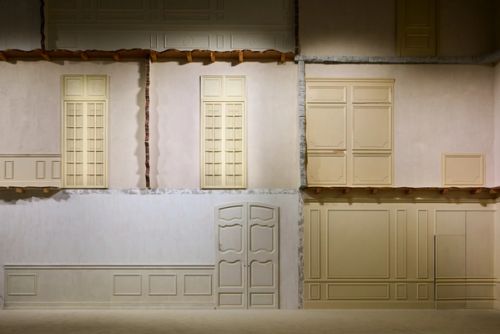 The set design for Prada’s Fall/Winter 2026 show is inspired by the idea of an old house stripped of its inner walls and floors, revealing its interior as one continuous backdrop.