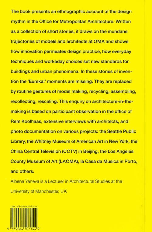 This book presents an ethnographic account of the design rhythm in the Office for Metropolitan Architecture. Written as a collection of short stories, it draws on the mundane trajectories of models and architects at OMA and shows how innovation permeates design practice and everyday techniques and workaday choices set new standards for buildings and urban phenomena. In these stories of invention the 'Eureka!' moments are missing. They are replaced by routine gestures of model making, recycling, assembling, recollecting, rescaling. This enquiry into architecture-in-the-making is based on participant observation in OMA, extensive interviews with architects, and photo documentation on various projects: the Seattle Public Library, the Whitney Museum of American Art in New York, the China Central Television (CCTV) in Beijing, the Los Angeles County Museum of Art (LACMA), the Casa da Musica in Porto, and others.