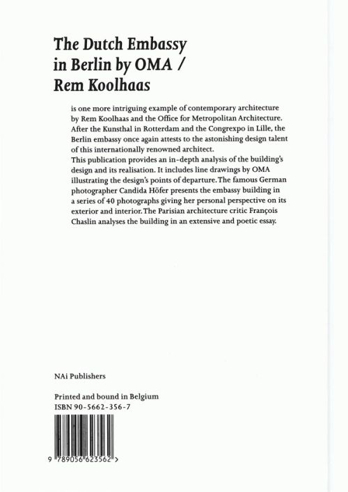 Publisher's blurb: The Dutch Embassy in Berlin by OMA/Rem Koolhaas is one more intriguing example of contemporary architecture by Rem Koolhaas and the Office for Metropolitan Architecture. After the Kunsthal in Rotterdam and the Congrexpo in Lille, the Berlin embassy once again attests to the astonishing design talent of this internationally renowned architect. This publication provides an in-depth analysis of the building's design and its realisation. It includes line drawings by OMA illustrating the design's points of departure. The famous German photographer Candida Höfer presents the embassy building in a series of 40 photographs giving her personal perspective on its exterior and interior. The Parisian architecture critic Francois Chaslin analyses the building in an extensive and poetic essay.